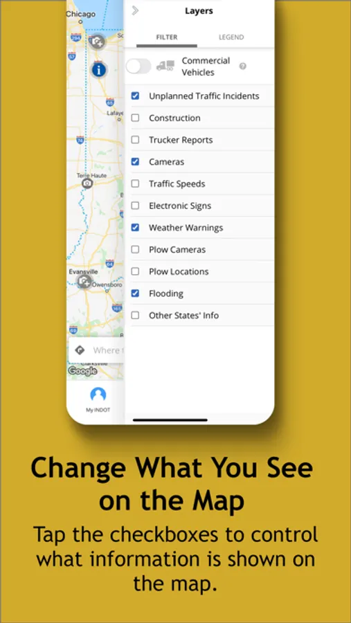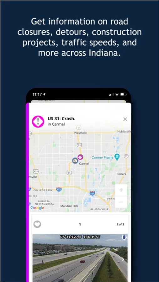 • Manage My INDOT personalized accounts including saved routes, areas, and camera views and email and text alerts