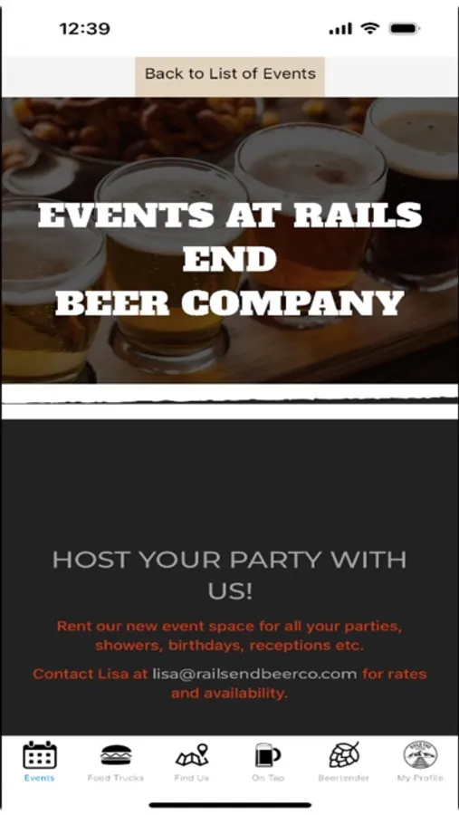 Rails End Beer Company Mobile App. Check what Events are upcoming, what food trucks are there, where you can find Rails beer and what beers are currently on tap at the brewery.