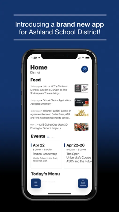 The event section shows a list of events throughout the district. Users can add an event to their calendar to share the event with friends and family with one tap.