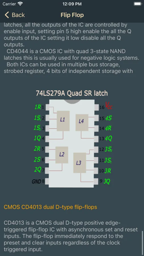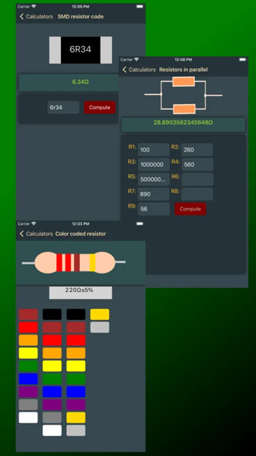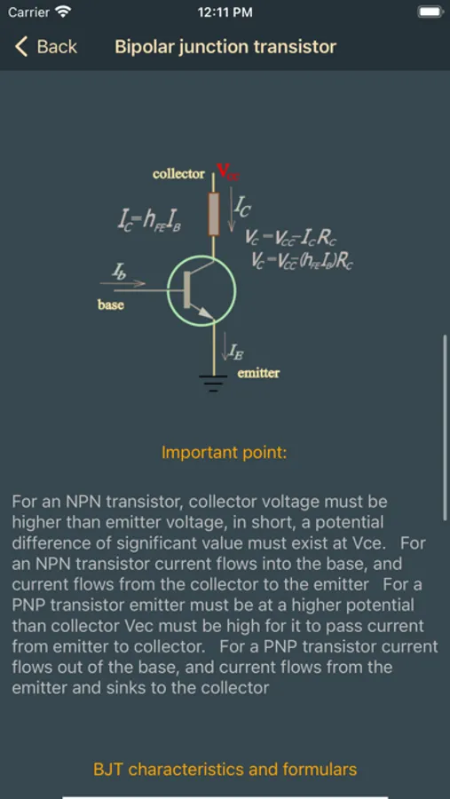 The app contains the electronic components reference section, electronic circuit reference section, and electronic circuit calculation section.