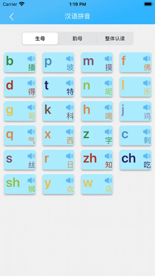 「拼音」学习拼音是学习汉语的重要一步,我们提供了拼音的声母、韵母、整体认读。宝宝可以通过点击学习发音,每个拼音下边有相关发音对应的汉字指示,让学习更简单。