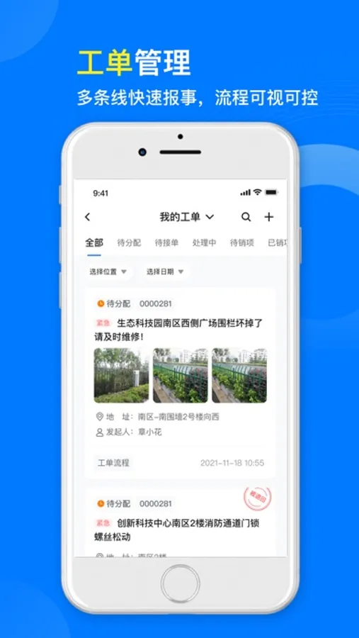 面向写字楼的招商租赁公司、物业管理公司管理人员和员工提供移动办公工具,包含工单管理、设备巡检、装修管理等功能,旨在让物业员工、资管人员更轻松的完成工作,让管理层更便捷的统筹工作,以提高招商租赁公司、物业管理公司整体工作效率。