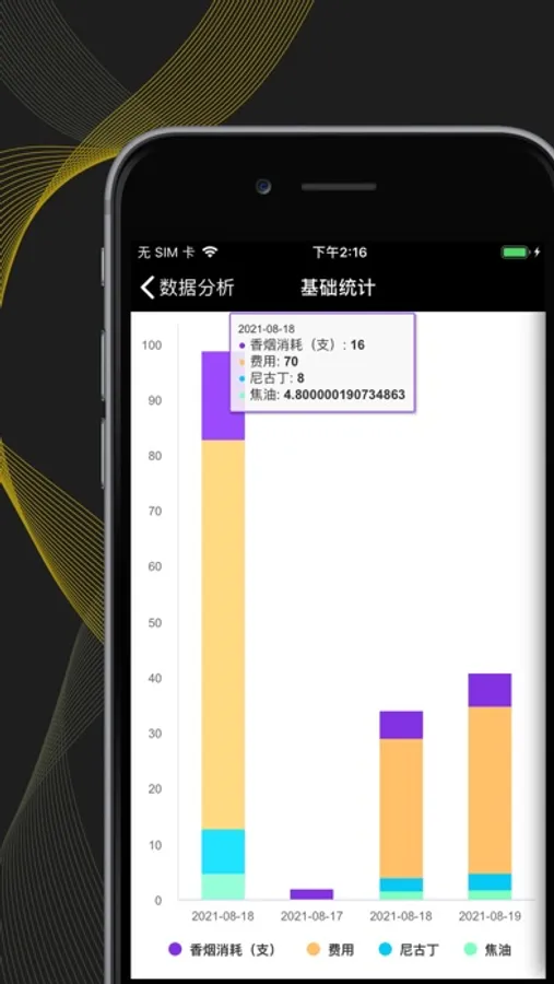 多德戒烟助手,数据以周、月、汇总的方式向你展示你抽了多少支香烟, 抽烟一共消费多少钱,快速了解历史抽烟情况,同时还能知道抽烟摄入了多少尼古丁和焦油,不用别人念你自己就可以督促自己戒烟!