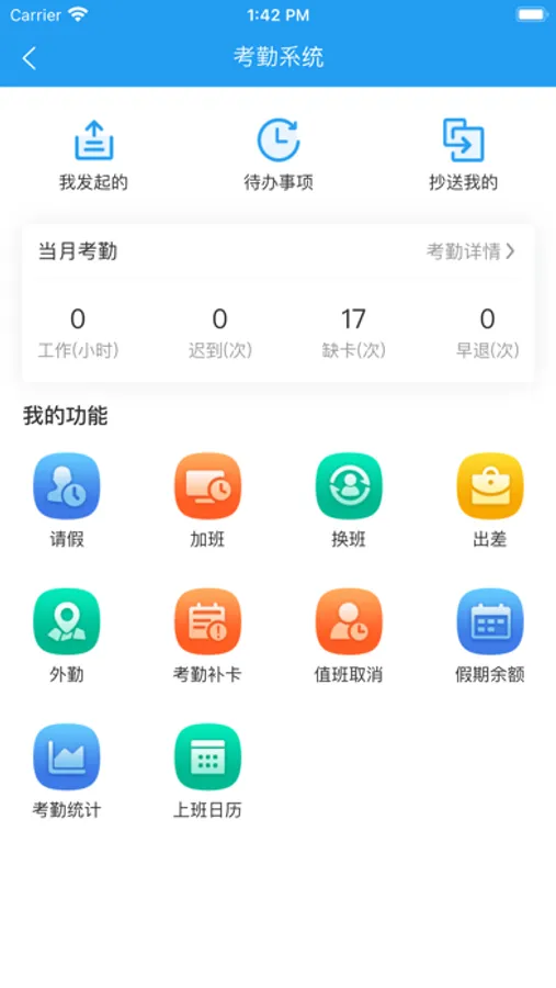 考勤管理包括加班、请假、出差、外勤、换班、调整班次、考勤补卡、值班取消申请等