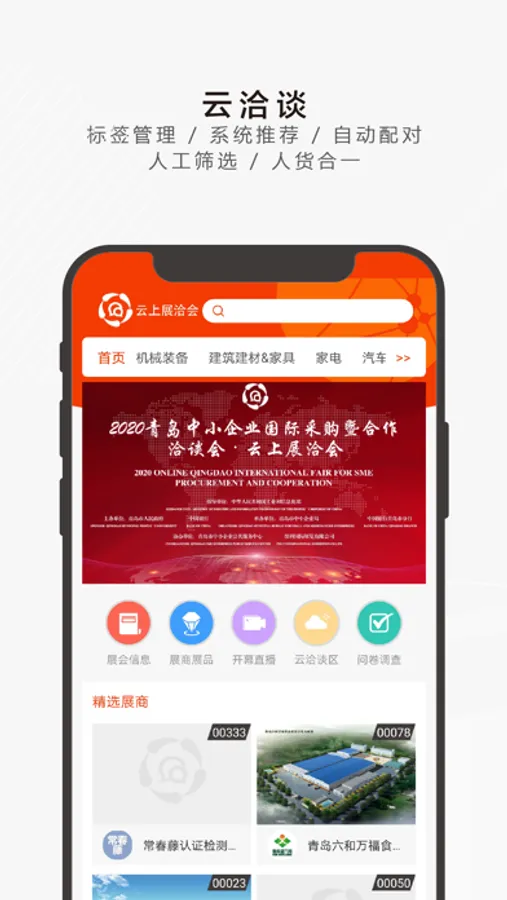 从云展示到云论坛,从云洽谈到云数据,青岛采洽会系统构建了在线展览业务一站式解决方案。企业直播和大会直播,高效流畅的“云上”会议系统,让线上线下无缝融合;云展系统用户的行为数据帮助供需双方实现高效沟通!