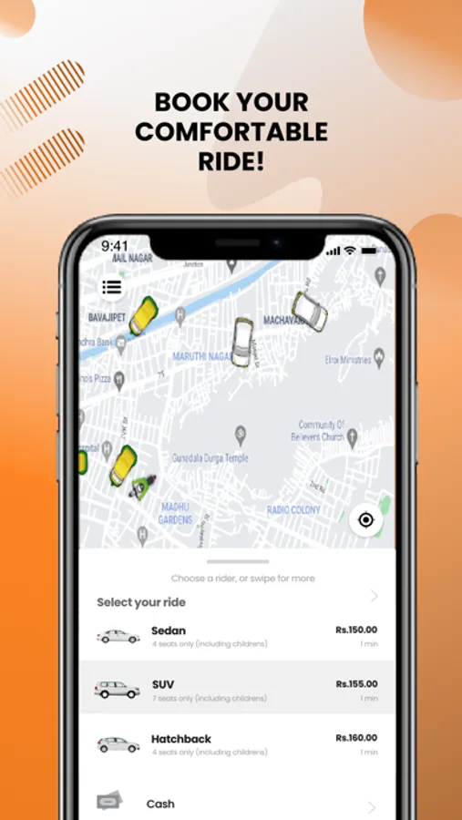 • See all available cabs/taxis near your location being displayed on the map