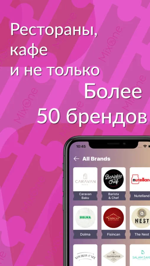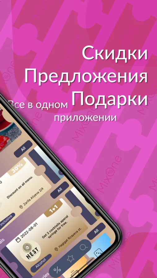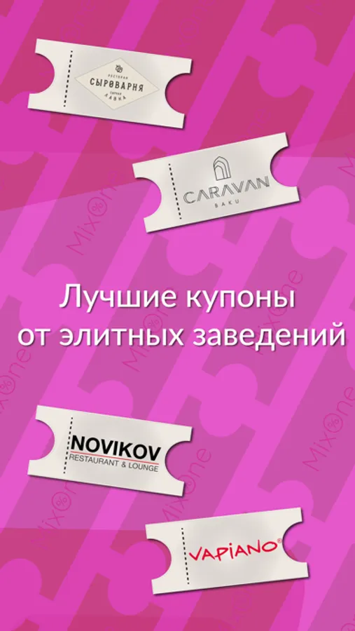 Теперь вы можете пользоваться множеством различных услуг с максимальной выгодой для себя - получайте эксклюзивные скидки, специальные предложения и раздачи от элитных заведений с MixOne.