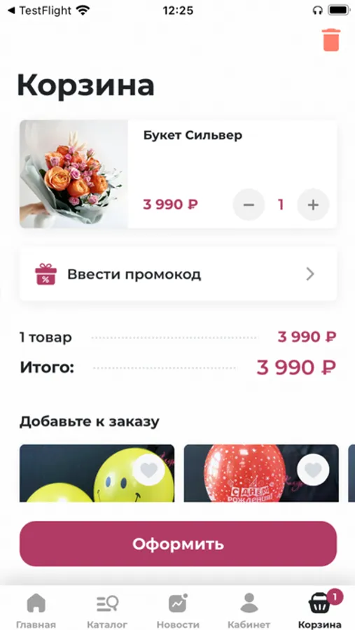 Мобильное приложение Клумба позволяет клиентам оформлять и оплачивать заказы онлайн на своих мобильных телефонах. У нас вы можете выбрать букет на любой вкус, оформление, добавить к заказу шарики и сладости.