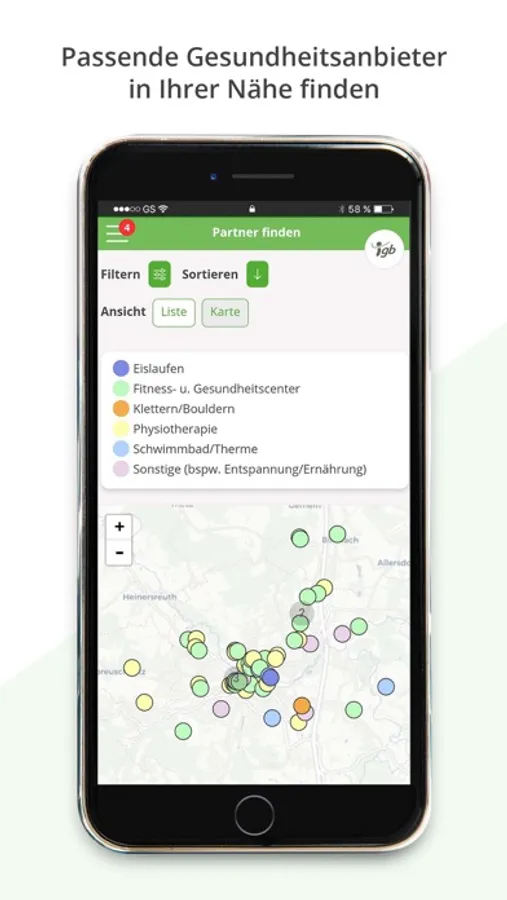 • Den passenden i-gb Partner (anhand von vorliegenden Bewertungen) in Ihrer Nähe finden, um dort mit Ihrer i-gb Card bzw. i-gb App ermäßigt oder sogar kostenlos aktiv zu werden. Beispielsweise können Sie folgende Gesundheitsanbieter besuchen und eine Ermäßigung erhalten: