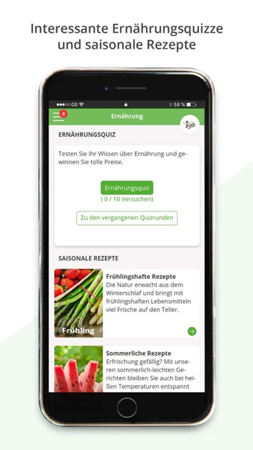 • An unseren wissenswerten Ernährungs-/Entspannungs-/Bewegungsquizzen teilnehmen und attraktive Preise gewinnen, sich von unseren saisonalen Rezepten inspirieren lassen oder sich Trainingsvideos/ Entspannungstipps anschauen.