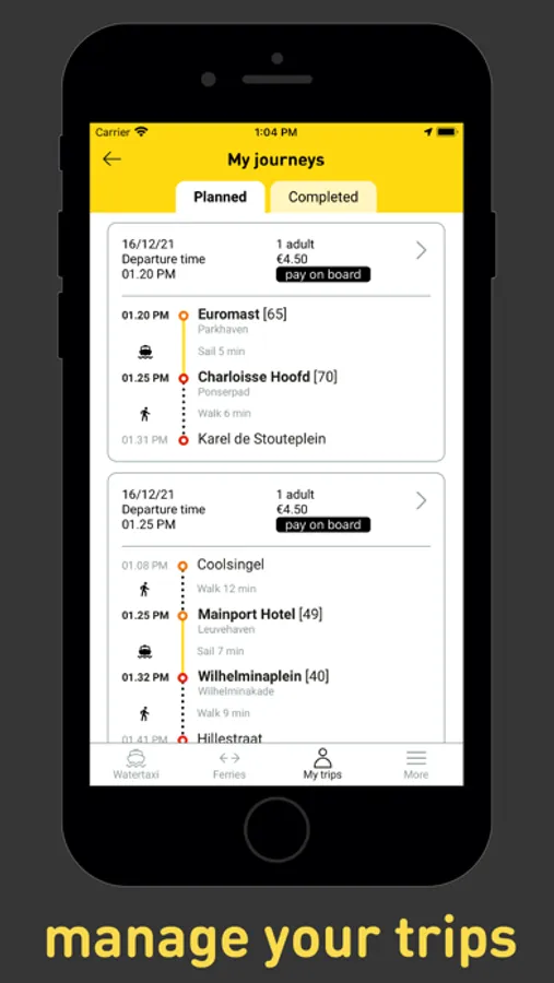 The app shows you all 50 stops in our operating area, plus information on how to transfer to other forms of public transport. It will also tell you how much time you have spent travelling in Rotterdam/Schiedam and show previous journeys you have booked with the app.