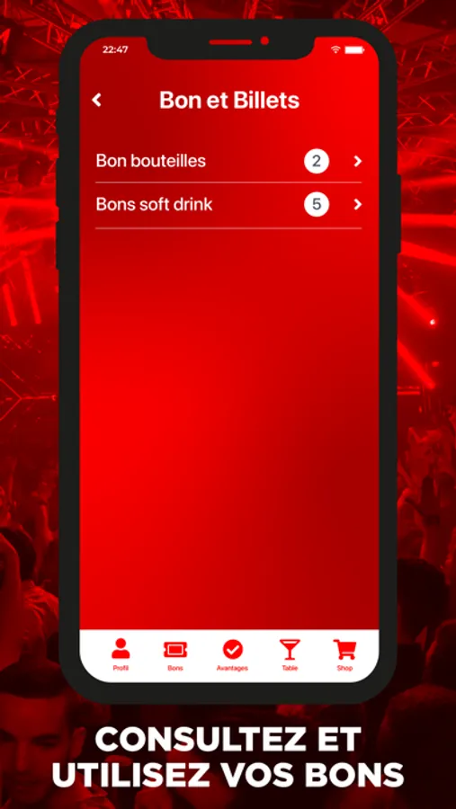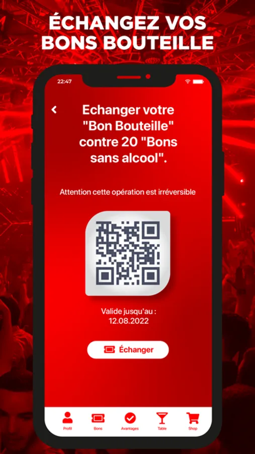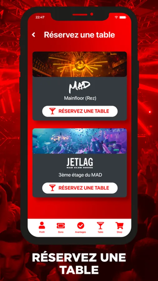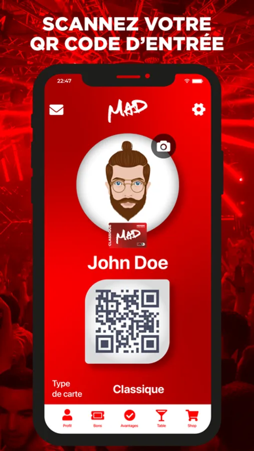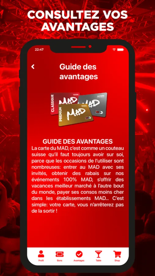 Votre QR Code personnel pour entrer au MAD avec vos invités, vos bons bouteilles (ou soft drinks), la possibilité de réserver une table, les nombreuses réductions auxquelles vous avez droit, les billets pour les events du MAD… Tout est dans l’application ! Et bien plus encore. Be MAD.