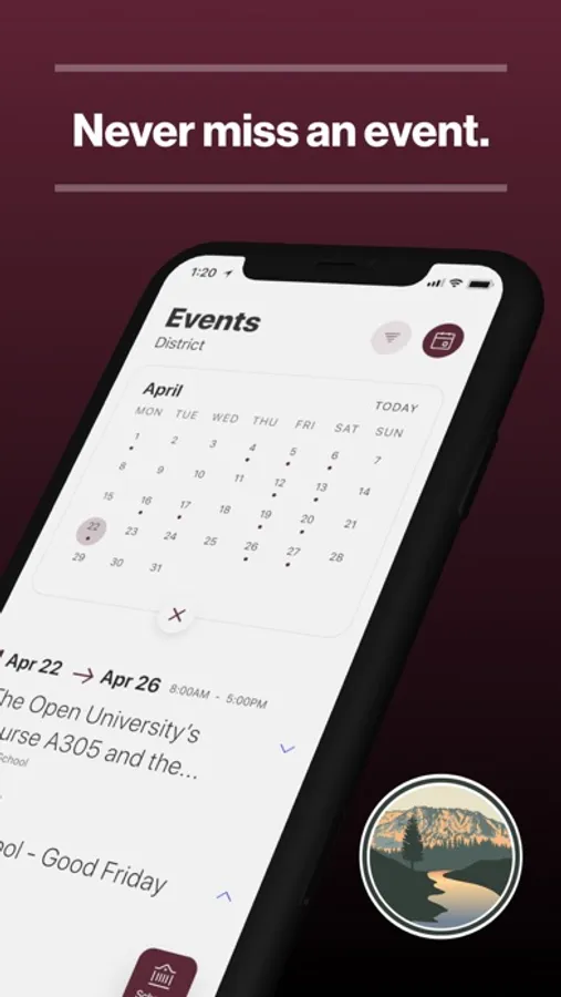 The event section shows a list of events throughout the district. Users can add an event to their calendar to share the event with friends and family with one tap.