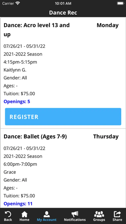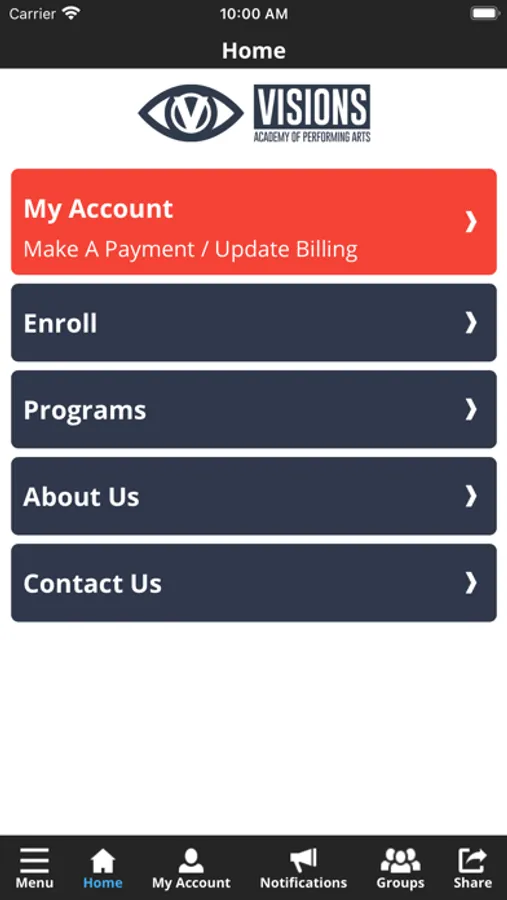 The Visions app allows you to manage your account with ease, register for classes, parties and special events. You'll also receive important notification about class changes, closings, registration openings, special announcements, and upcoming events.
