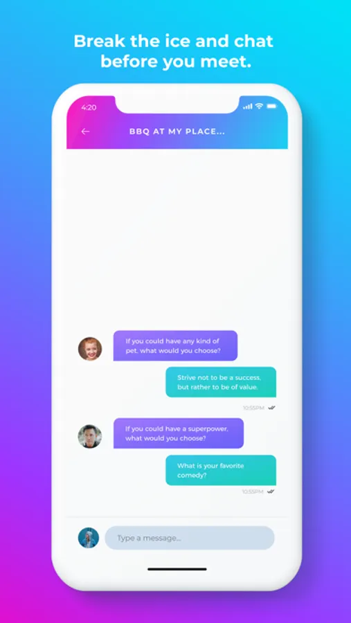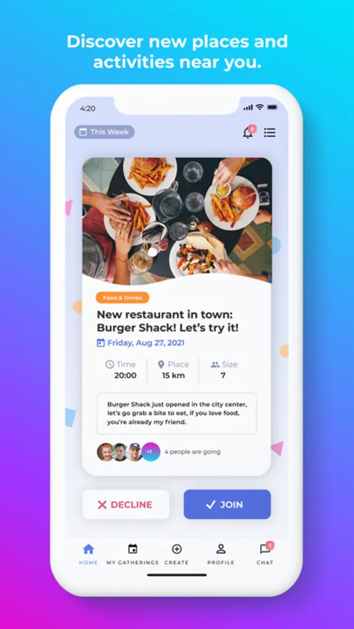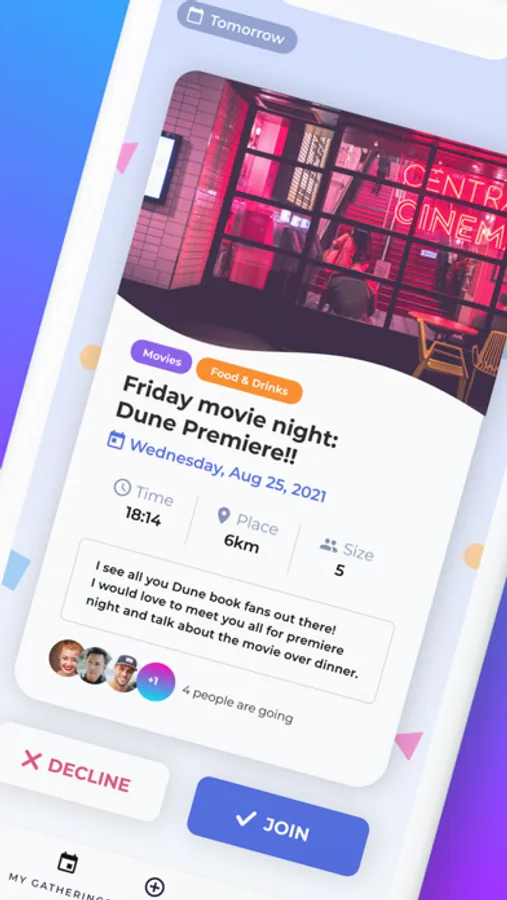 Once you have signed up we will show you a few gatherings near you, attend the ones you like or discard them to see more. You can filter the gatherings by date, tags, distance and others... Once you tap 'Join', you can chat with the other attendees. Break the ice and say hello before you meet them!