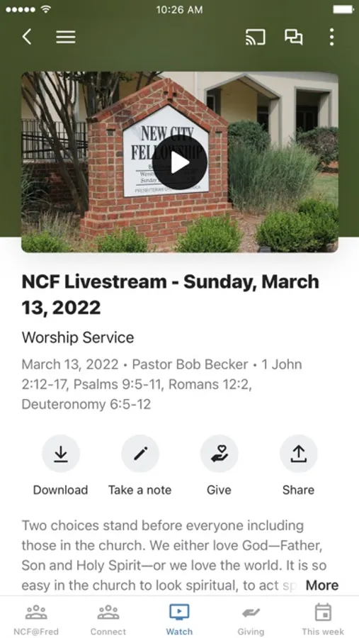 This app will help you stay connected with the day-to-day life of New City Fellowship. With this app you can: watch or listen to past messages; stay up to date with push notifications; share your favorite messages via Twitter, Facebook, or email; and download messages for offline listening.