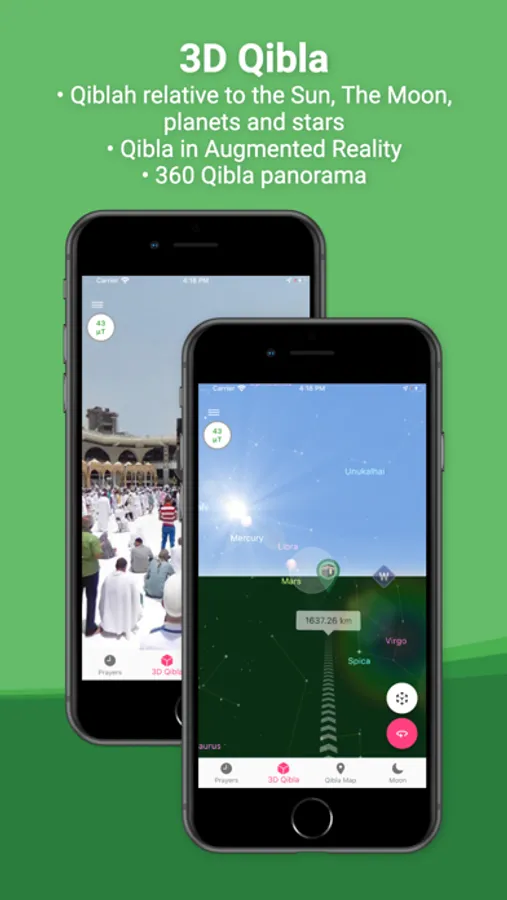 • 3D Qibla provides a view of the Qibla in a real-world environment using augmented reality as well as walking through inside Grand Mosque using 360 panorama. User can also determine Qibla relative to the Sun, the Moon, stars and planets.