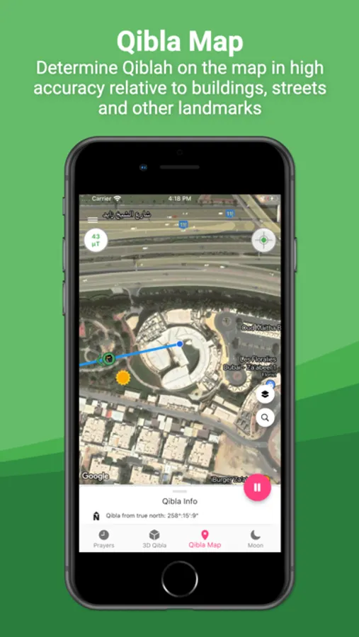 • Qibla Map displays Qibla on an interactive map so that user visually verify Qibla direction relative to nearby buildings and streets.