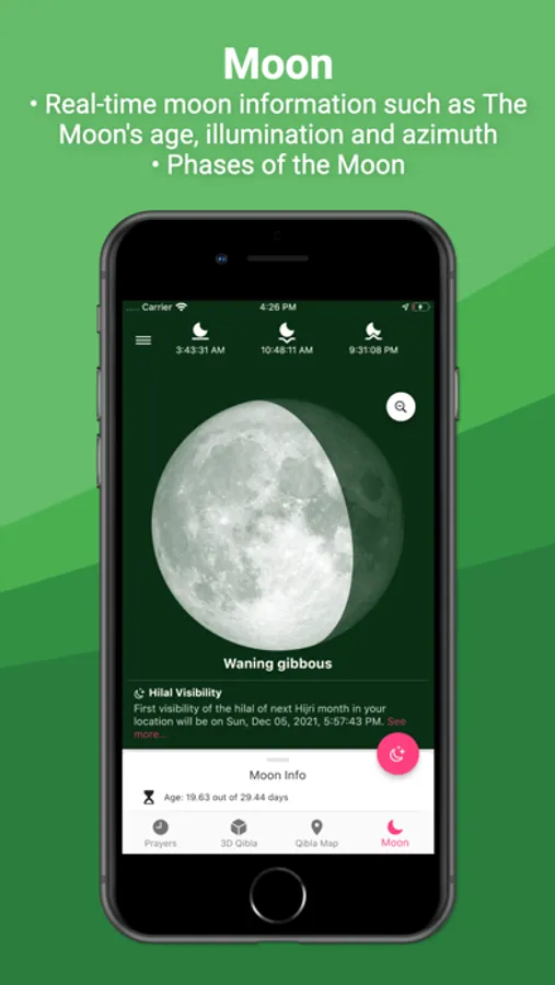 • Miqat displays the Moon in real time, along with the Moon’s age, illumination, and phases.