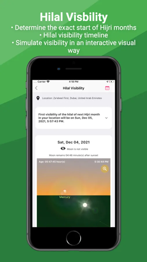 • User can simulate the first moment of the visibility of the hilal in an interactive visual way.
