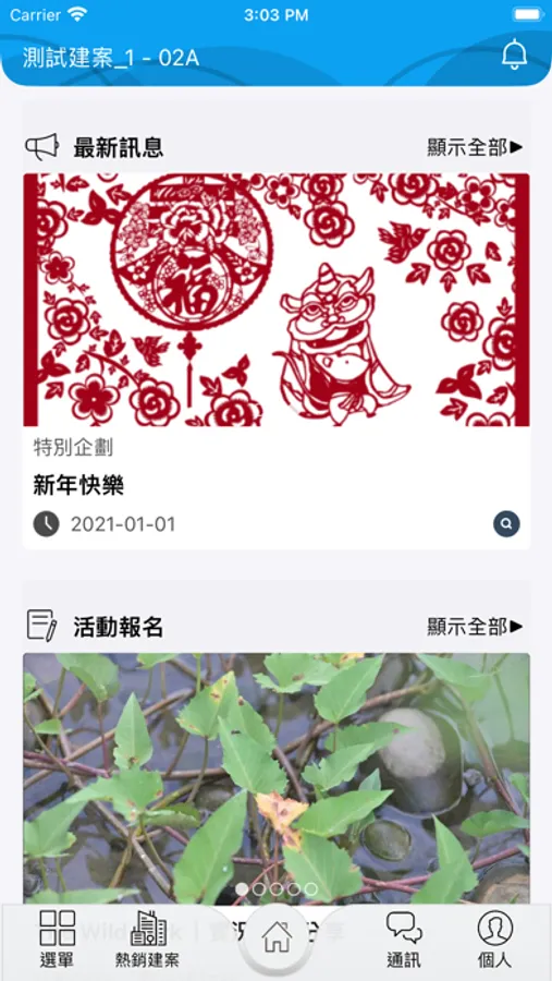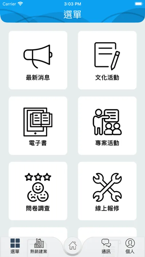 最新訊息、活動報名、電子書、專案活動、問卷調查、線上報修、繳款進度、工程相片、活動花絮。