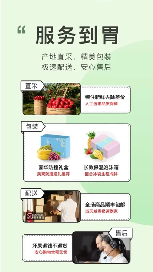 水果不新鲜,有破损,不必联系客服,App内一键操作,直接退款不退货!