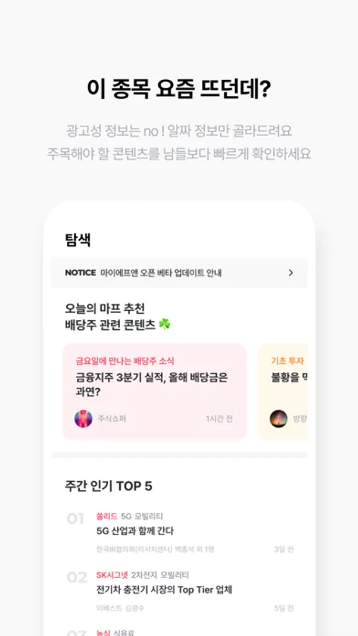 개인에게 맞춰 필요한 투자정보부터 정리하고, 정보탐색 시간을 아껴주는 앱이예요.