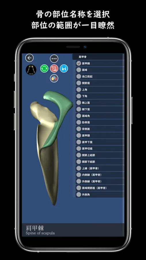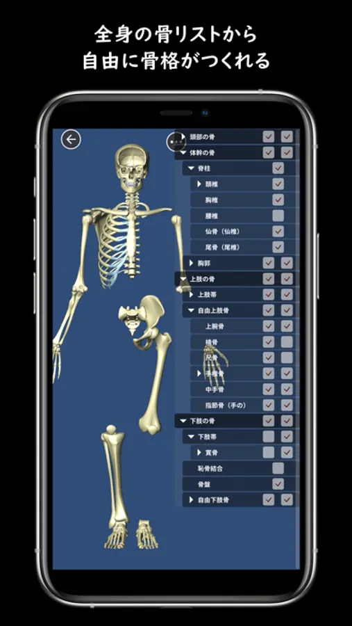 前頭骨から環椎、鎖骨、足の指節骨まで、各骨の部位名称を収録。解剖学的に精緻なCGモデルで部位を立体的に特定できます。