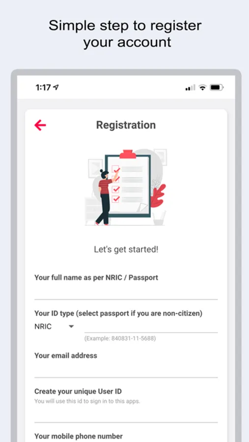 During account registration process, you will need to enter a National Registration Identity Card Number (NIRC) or Passport Number for Non-Malaysian Citizen and create your unique user ID. The app will send OTP number for phone verification. Finally, you need to register a 6-digit PIN number and this pin will be asked when you transact in the app.