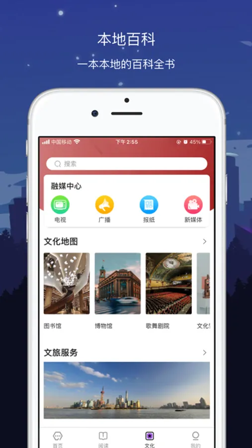 2.文化服务中“融媒中心”集中了本地和中央的电视、广播、报纸、主流新媒体。最大程度地方便居民接收新闻与文化娱乐信息。城市名片、城市百科、文化地图、旅行景点形成了深度的内容挖掘,梳理整合了武汉市的历史人文底蕴以及文化服务。