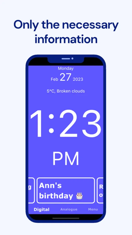 Empower yourself or your loved ones with Calendar Clock, the indispensable app designed to cater specifically to the needs of the elderly, individuals with dementia, and those affected by Alzheimer's. This comprehensive tool combines a clock, agenda, reminders, and personal messages to provide a seamless and supportive experience for individuals facing memory impairment or a reduced sense of time.