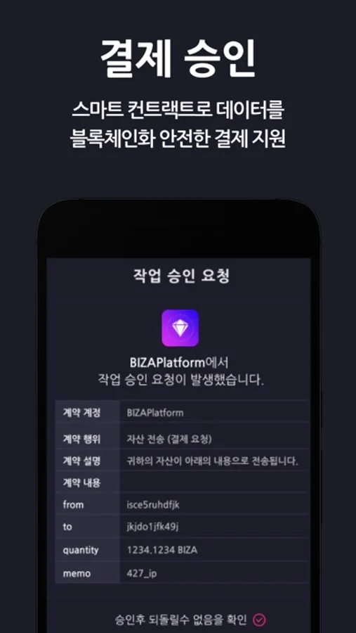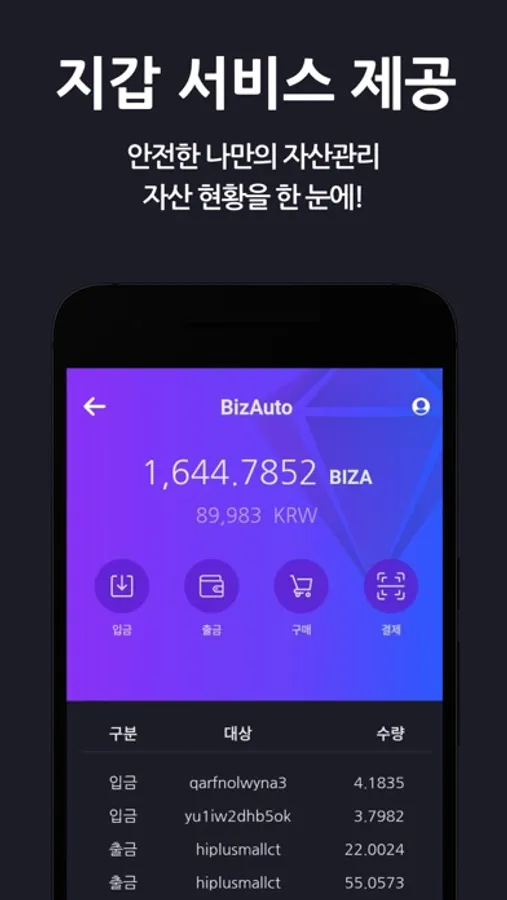BizAuto 플랫폼에서는 중앙화 된 서버 없이 모든 데이터를 유저들이 암호화, 복호화하여 블록체인에 저장하고 활용하게 하는 것을 목표로 하고 있습니다. 이러한 데이터는 각 산업에서 필요한 활용가능한 데이터로 전환하여 여러 분야의 산업에서 유효하게 사용될 수 있습니다. DID 기술의 강력한 보안으로 개인 정보의 유출 걱정을 줄이고, 사용자는 개인의 신원 정보를 본인이 관리하여 결제 및 본인 인증을 손쉽게 할 수 있도록 만든 DApp입니다. 유저의 개인정보는 모바일 디바이스 내에 기기 식별값과 BIZA Platform App 계정 정보 등으로 암호화 되어 저장되어 있습니다. 이 정보를 제공받으려면 DeepLink를 통해 BIZA Platform App에 요청해야 합니다. 또한 다양한 암호화폐의 사용이 가능하며, 이용자 간의 불필요한 수수료를 최소화하여 부담을 덜었습니다.