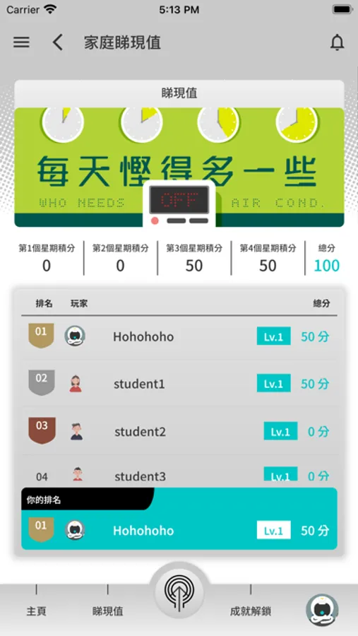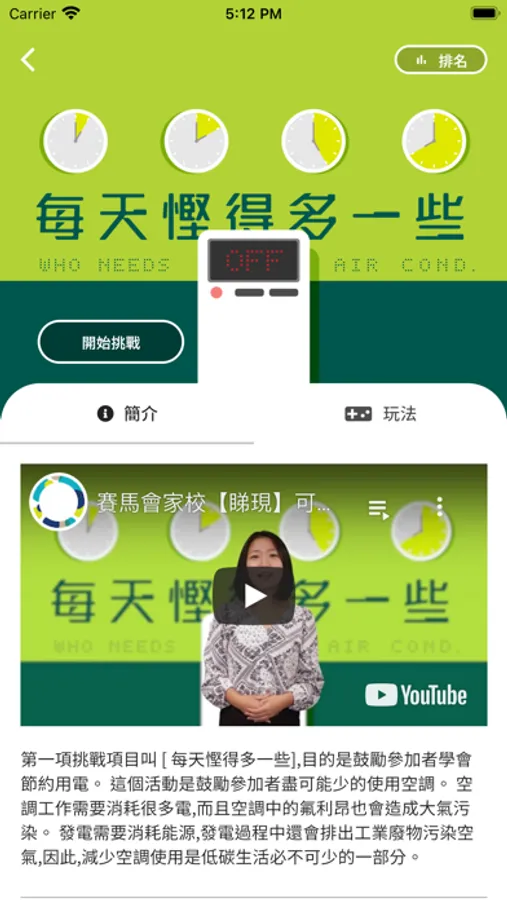 這個計劃用這個手機應用程式作為主要平台,方便大家在學校和家裏都可以進行環保挑戰。這個手機應用程式以打怪獸為主題,我們會有一系列環保怪獸要打敗,你們要在學校和家裏進行一系列環保挑戰,例如:關冷氣、減少用電器做家務、關掉不用的備用電、5分鐘洗澡挑戰等等。挑戰成功會獲得環保力量積分,來換取精美禮品!大家快來挑戰!