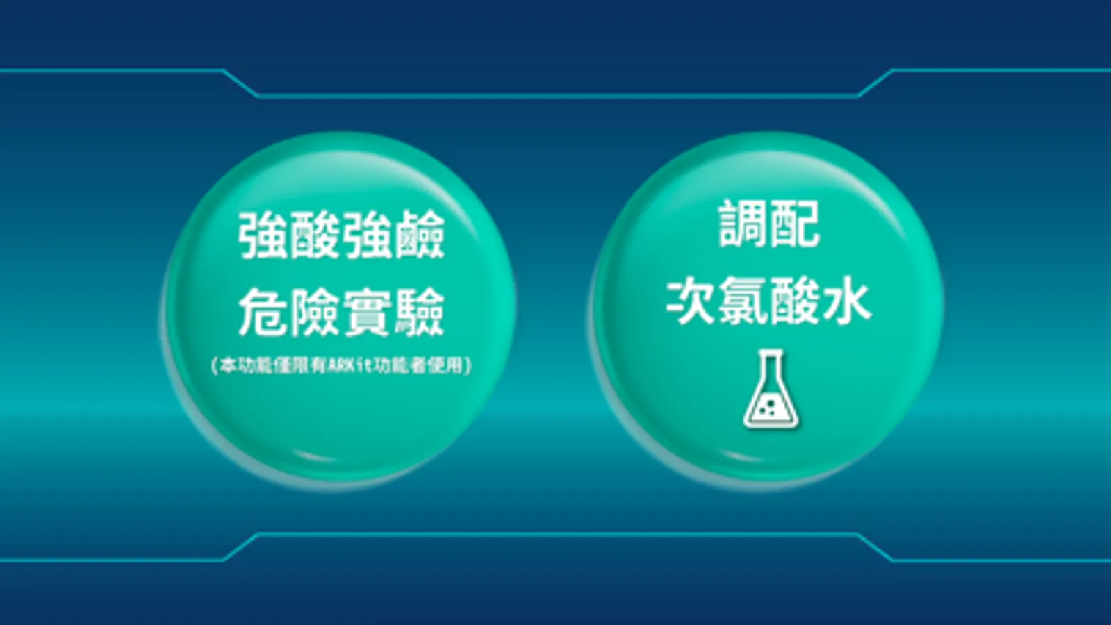 「強酸強鹼危險實驗」:使用者可以運用手勢,模擬實驗操作真實手感,透過手機或平板的鏡頭,辨識手掌動作,拿取及移動虛擬實驗物品,進行強酸強鹼稀釋實驗,除可避免實驗危險,並可幫助使用者實作學習。