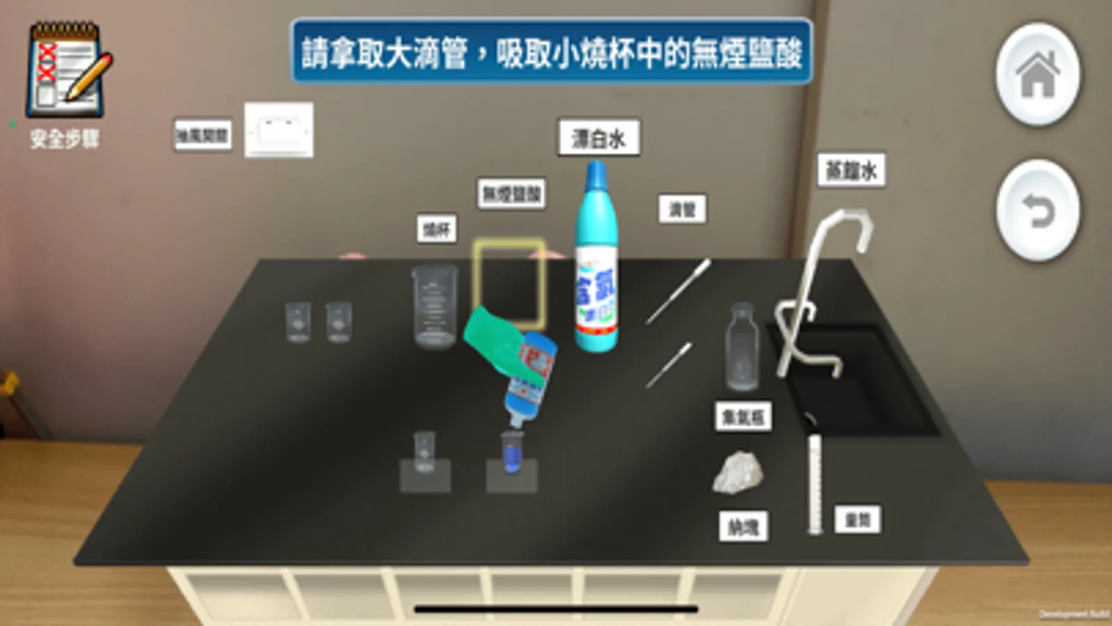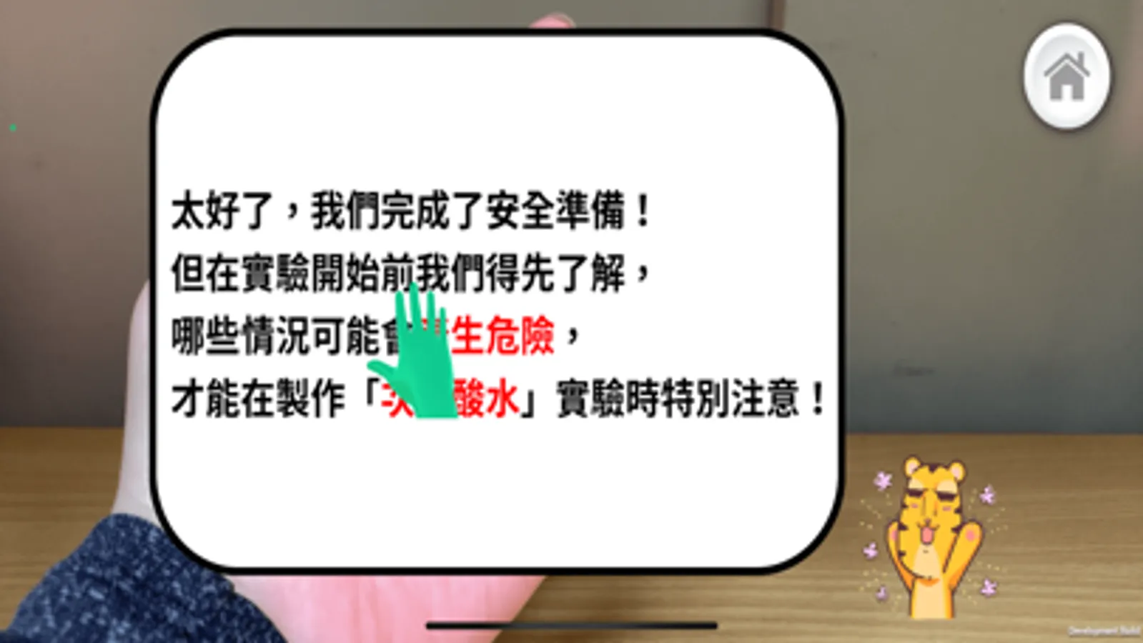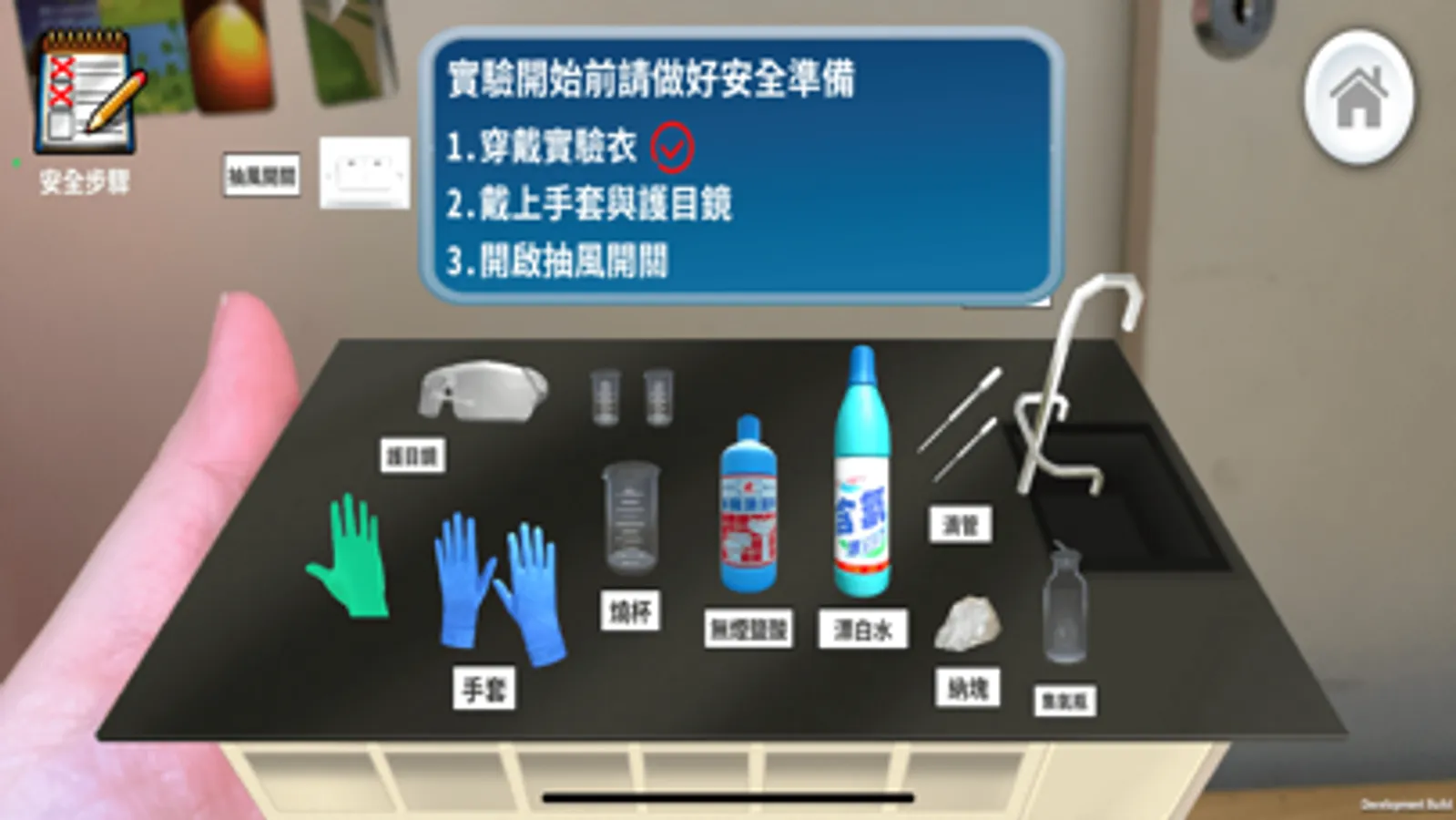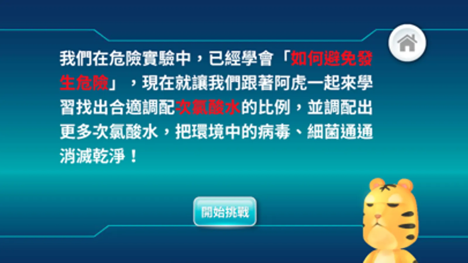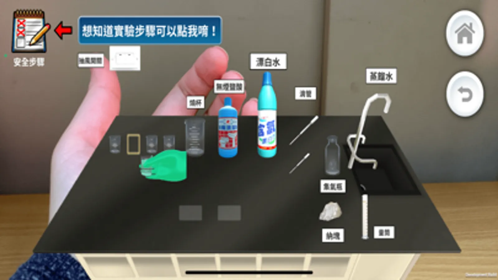《危險的科學實驗》遊戲具有手勢辨識和探究實驗的特色。遊戲主題分為「強酸強鹼危險實驗」和「調配次氯酸水」兩個單元。