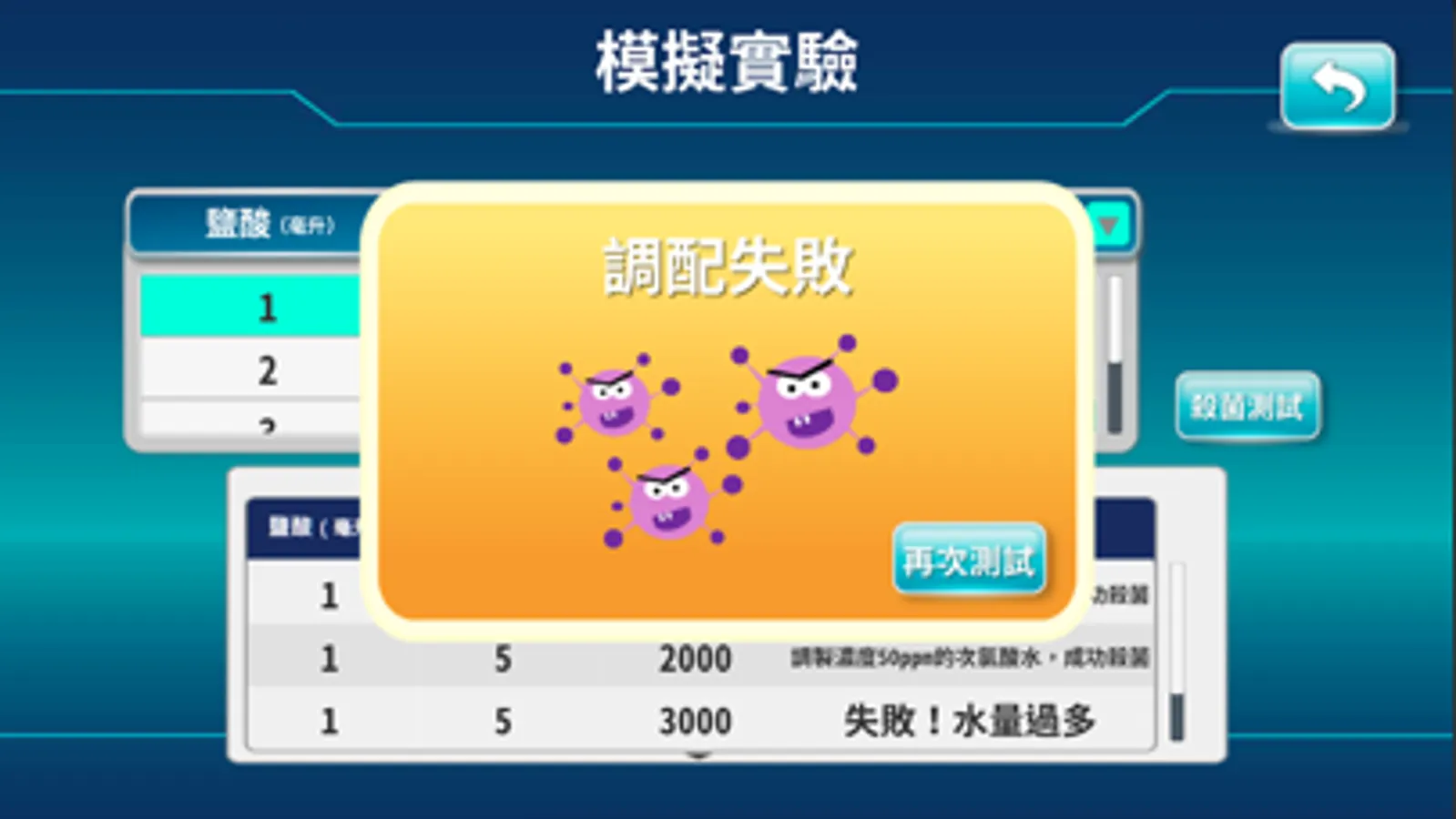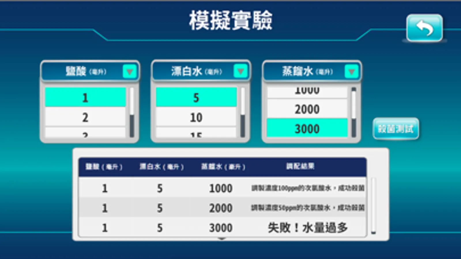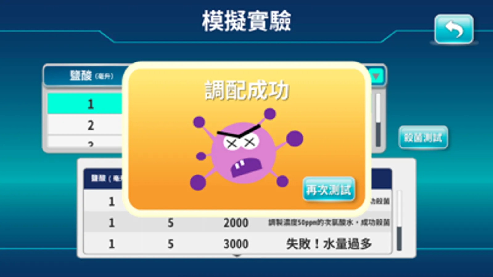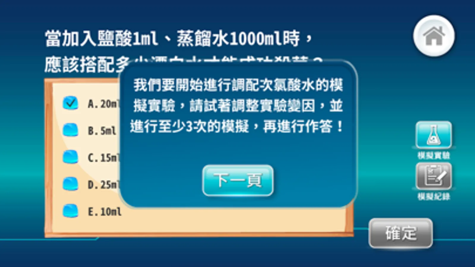 「調配次氯酸水」:透過製作次氯酸水的調配模擬介面,取得實驗數據,進而分析與比較表格數據,形成解釋,培養使用者判讀與解釋圖表的能力。