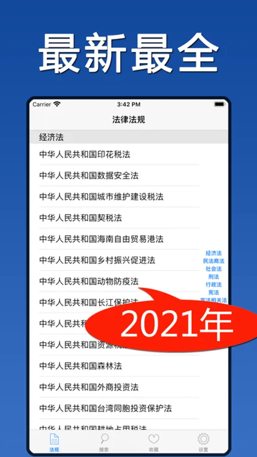 法律App收录超过3000部中华人民共和国法律法规,完全免费,且无使用限制,全部同步更新至2021年最新颁布和修订版。