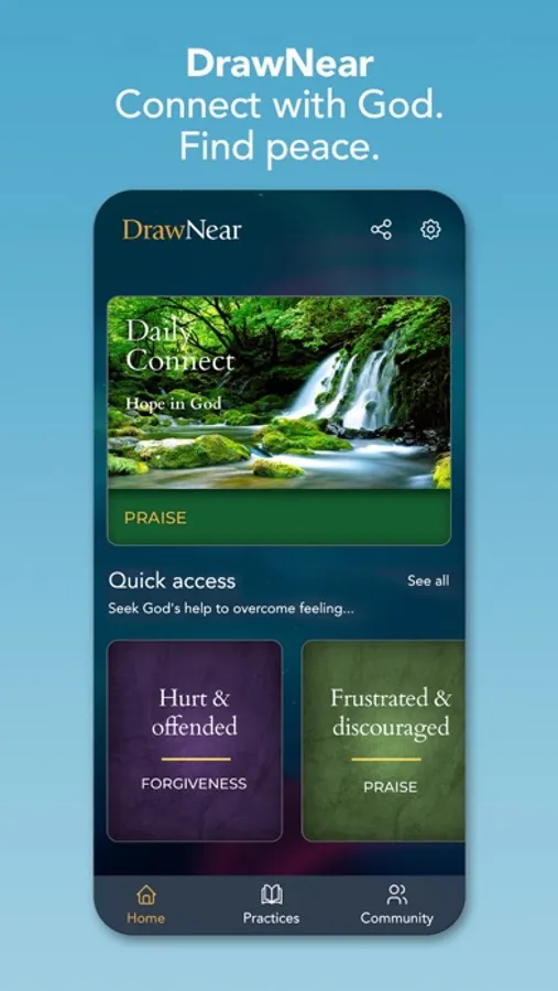 Do you struggle with anxiety, discouragement, anger, indecision, or resentment? DrawNear is the first app using Biblical practices to help overcome life’s struggles and find profound peace. DrawNear’s practices give simple steps to follow and story models to imitate and inspire; the app's mentor-guided sessions make it easy to begin using the practices.