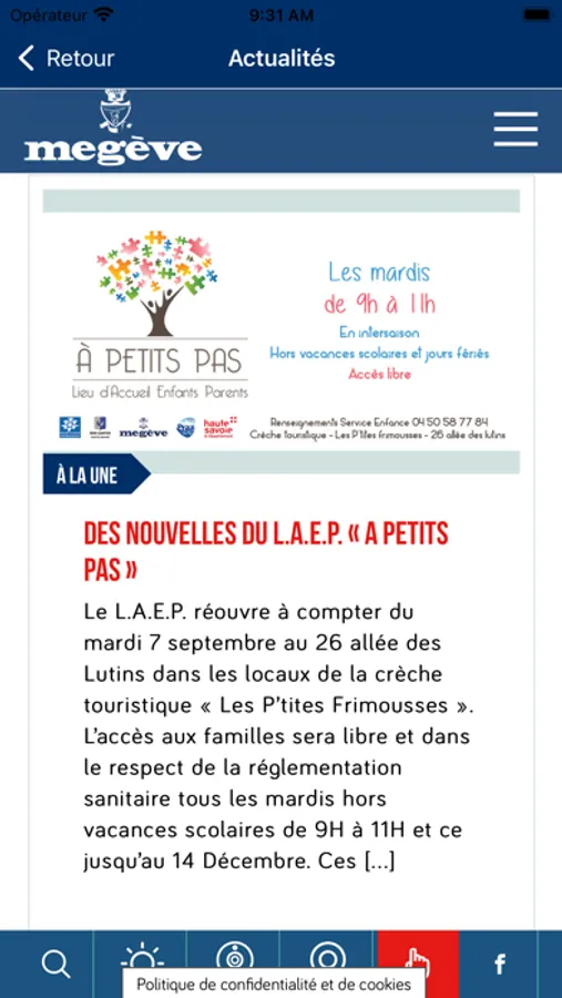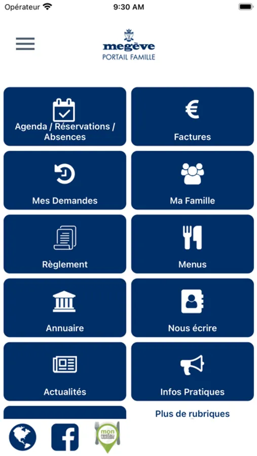 Application de la commune de Megève qui permet la gestion des activités périscolaires et extrascolaires de vos enfants en accédant aux fonctions du portail familles sur son smartphone ; vous pourrez consulter le planning, effectuer des demandes de réservation et des demandes d' absence et les suivre, accéder au dossier de votre famille, consulter vos factures, accéder aux menus du restaurant scolaire et recevoir des notifications.