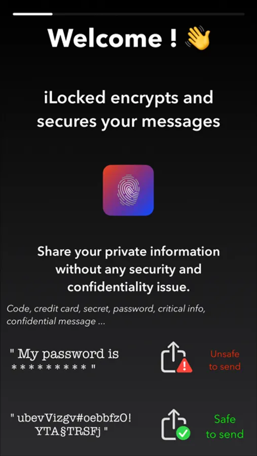 Any secret to share ? iLocked encrypts it for you. Now you can send the secure message through your favorite messaging app without any confidentiality or security issue ! Password, credit card, ids, confidential info. Everything is possible.