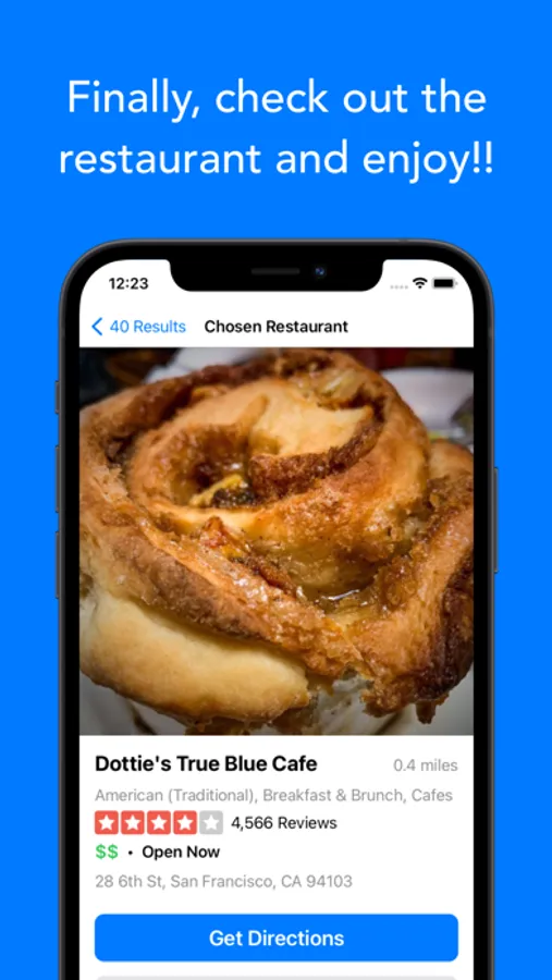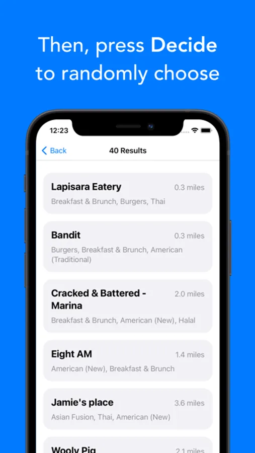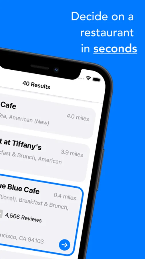 Decide will take in your location and preferences and find a lot of great restaurants around you. Then, you simply can let the app randomly decide a restaurant for your group to enjoy! You can get directions and/or view the restaurant on Yelp for more details. All of our data is found with the help of Yelp, so you can be confident in the places it selects for you!
