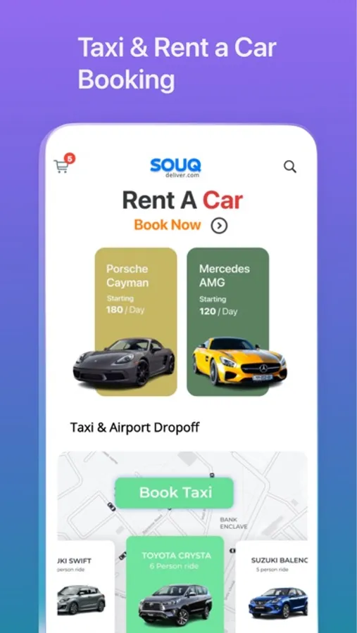 Souq Deliver will be providing Rent a car service through our service provider partner local rent, which has top branded cars including Kia, Hyundai, Nissan, Mitsubishi, Renault, Toyota, MG, Mazda, Peugeot, Mini Cooper, Ford, Mercedes Benz, Range Rover, Porsche, Audi, BMW, Cadillac, Maserati, Bently, Tesla, Lamborghini, Ferrari, etc