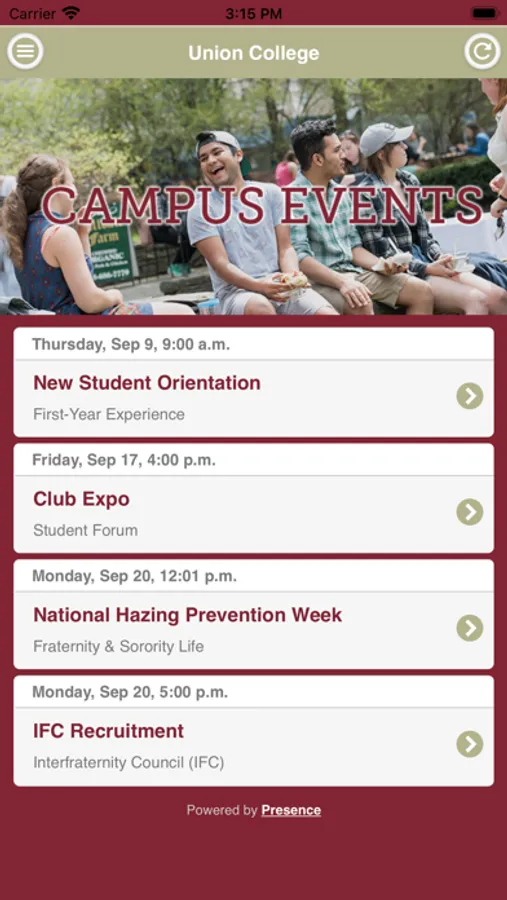 Powered by Presence. Presence provides a web and mobile platform to universities and colleges to help increase student engagement, assess involvement, allocate funding efficiently, and improve retention through simplifying and digitizing processes, collecting, structuring, and analyzing involvement data, and provides tools to help reach and engage more students.
