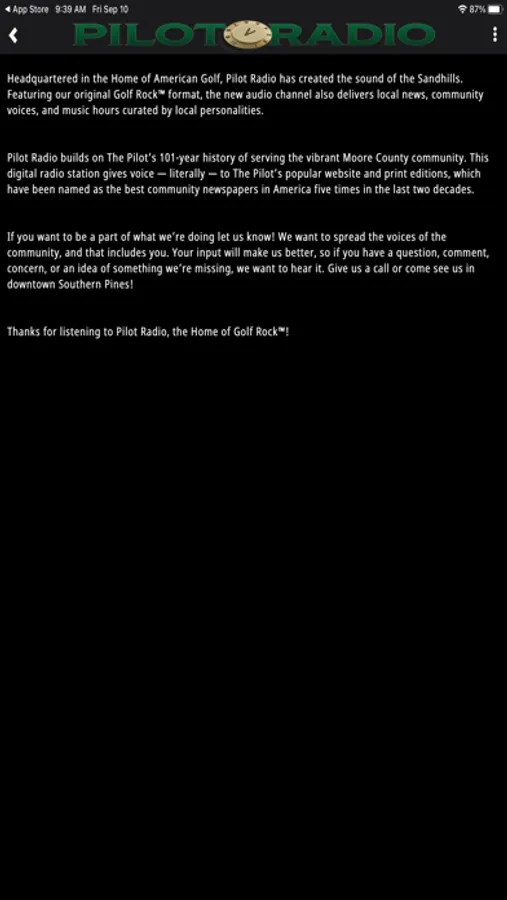 Pilot Radio builds on The Pilot’s 101-year history of serving the vibrant Moore County community. This digital radio station gives voice — literally — to The Pilot’s popular website and print editions, which have been named as the best community newspapers in America five times in the last two decades.
