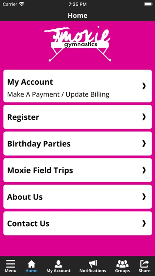 The Moxie Gymnastics app allows you to manage your account with ease, register for classes, parties and special events. You'll also receive important notification about class changes, closings, registration openings, special announcements, and upcoming events.