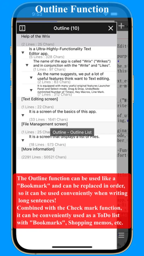 This App can be used as the Center of Text Editing Work such as Memo, Note, E-mail, ToDo list, Outline, Novel etc!