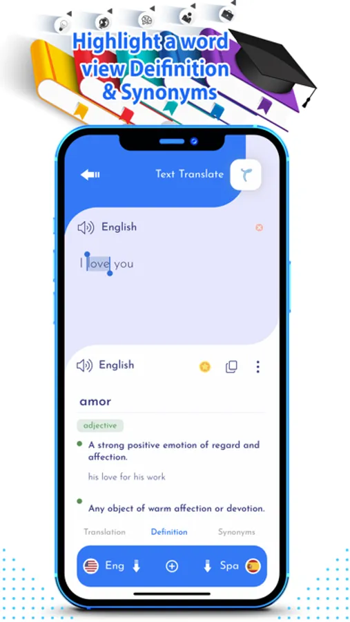 After the Text has been translated, Highlight the word and select Definition or Synonym to get its definition or synonym respectively