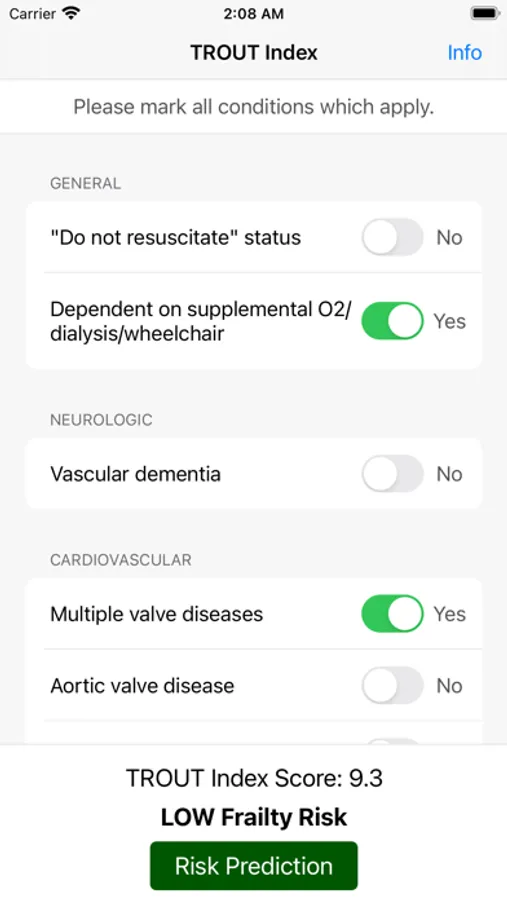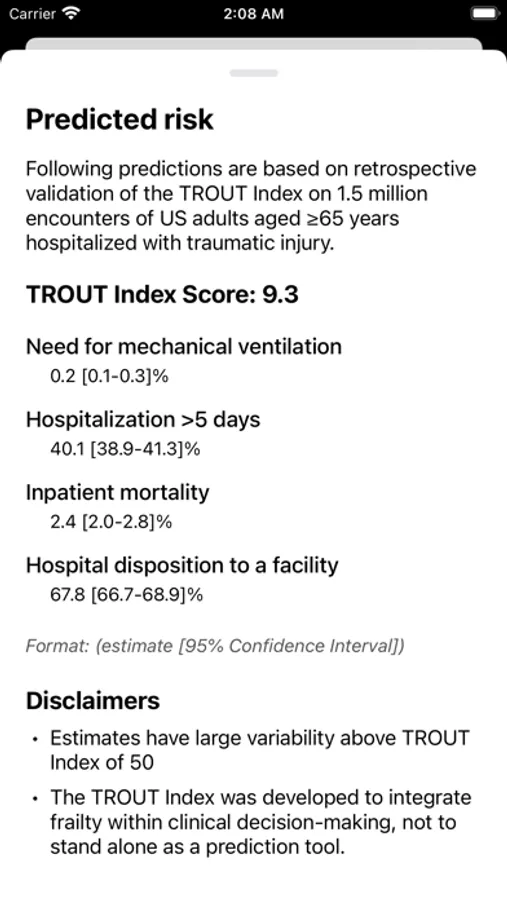 The TROUT Index was developed to rapidly prognosticate key adverse outcomes after injury among older adults using baseline frailty. The TROUT Index quantifies an individual's frailty risk (low, moderate, high) and outputs population-level estimates of outcomes base on baseline frailty.