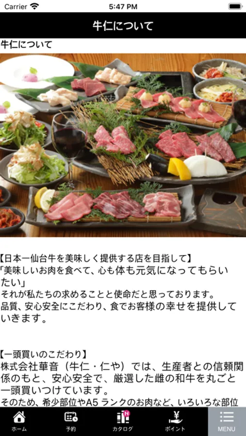 【仙台牛を日本一美味しく】をコンセプトに仙台や石巻で炭火焼肉を展開している「炭火焼肉牛仁」の公式アプリです。ポイント機能やスタンプカード機能などよりお得に美味しく焼肉を楽しんでいただけるような情報やサービスを発信いたします。