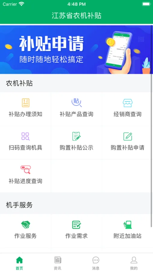 江苏省农机补贴App,能为在江苏范围内购买农机的用户提供在手机上办理农机补贴的服务。同时,也可以让江苏的农机管理人员,在手机上对购机者提交的补贴办理信息进行审核。从而简化农机办理补贴流程,方便农机管理人员审核验机,提高办理补贴效率。